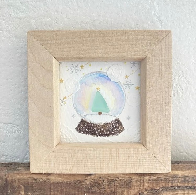 木製ミニフレーム入りのシーグラスアート 壁掛け又は置き で、ちいさなスペースに飾って頂けます。 (約7.5cm正方形) 3つの冬の景色から お選びください。 ・スノードーム ・ツリー ・おうち スマートレター送料 210円 頂戴いたします。